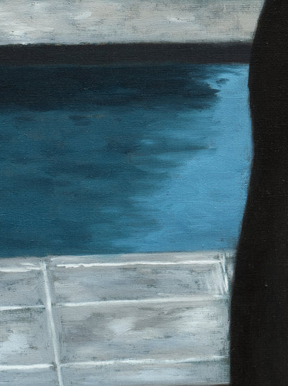Bathed in the stillness of night, Moonlight captures a moment of quiet reflection—poised between solitude and presence. A solitary figure stands at the edge of a pool, their back to the viewer, gazing out toward a mountainous horizon where the full moon hangs low and heavy in the sky. The cool palette and velvety textures evoke a hush that is almost tangible, while the tension between figure and landscape invites a deeper meditation on identity, longing, and the weight of stillness.